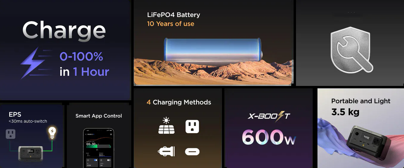 EcoFlow RIVER 2 має надшвидку зарядку, тобто ви можете повністю зарядити її лише за 1 годину від розетки. Вбудований контролер заряду MPPT дозволяє заряджати електростанцію за допомогою портативної сонячної панелі . Також можна заряджати через автомобільну розетку 12 В і через USB-C.
